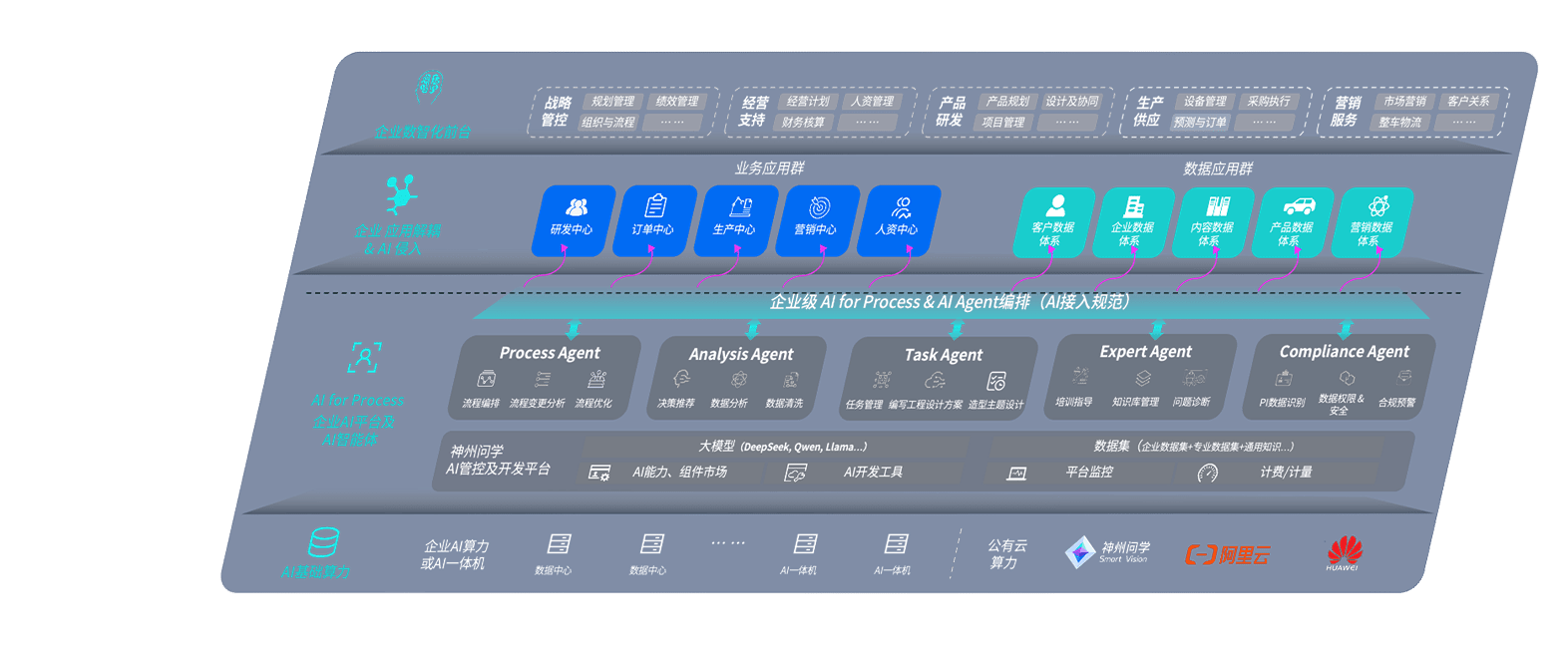 端到端的一站式AI工作空间深度融合了从企业战略规划到日常经营的全流程业务板块,,定向解决车企内部领域多、、部门多、、、、链条长、、、、场景碎片化等难题,,支持车企快速构建以AI为核心的生产力写作体系,,,,实现任务执行与AI能力的无缝集成与交互